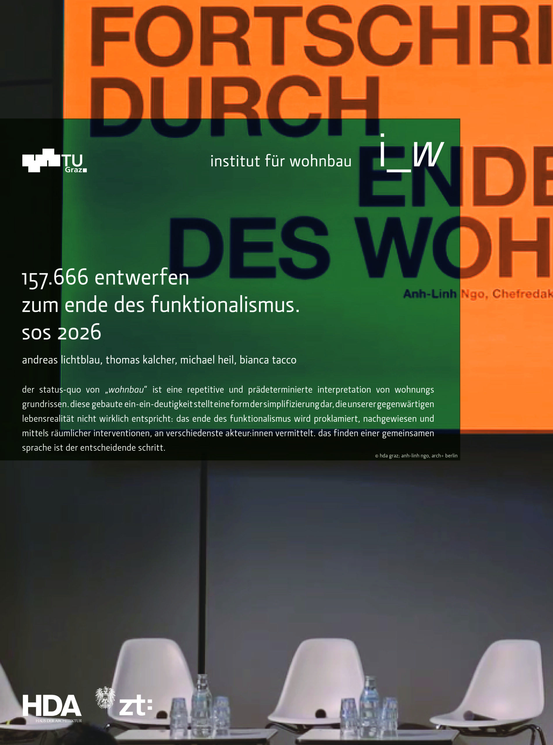 der status-quo von „wohnbau“ ist eine repetitive und prädeterminierte interpretation von wohnungsgrundrissen. diese gebaute ein-ein-deutigkeit stellt eine form der simplifizierung dar, die unserer gegenwärtigen lebensrealität nicht wirklich entspricht: das ende des funktionalismus wird proklamiert, nachgewiesen und mittels räumlicher interventionen, an verschiedenste akteur:innen vermittelt. das finden einer gemeinsamen sprache ist der entscheidende schritt.